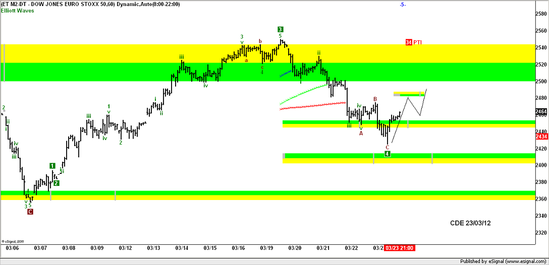 Sopra 2475/80 il primo segnale di fine correzione, chiusura di un ciclo bisettimanale ( 06 ? 23 marzo ). Conferme di una nuova fase di rialzo a favore di onda cinque con un'evoluzione rialzo/ribasso/rialzo come da modello in figura. Il mancato superamento di 2475 garantirà nuovi minimi sotto 2425, primo supporto a 2415.