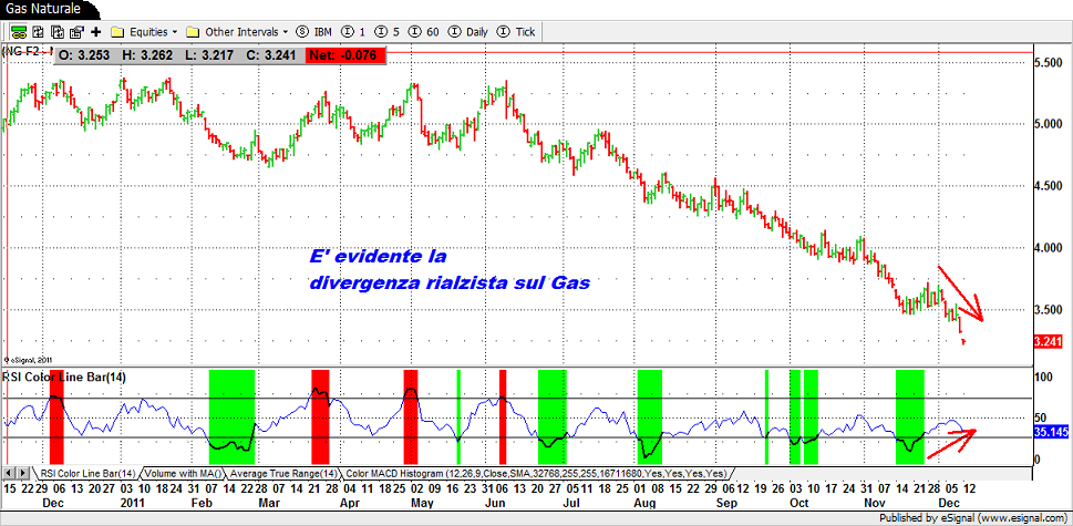 Il prezzo del Gas langue da mesi e mesi e il rapporto con il Crude Oil è diventato particolarmente attraente in questa fase, per chi volesse provare a comprare Gas. Questa notte il mercato ha apert in gap down, siamo quasi a ridosso di quota 3 dollari e infine vi è una divergenza rialzista sull'RSI piuttosto evidente. Con stop loss stretta si può fare un tentativo al rialzo.