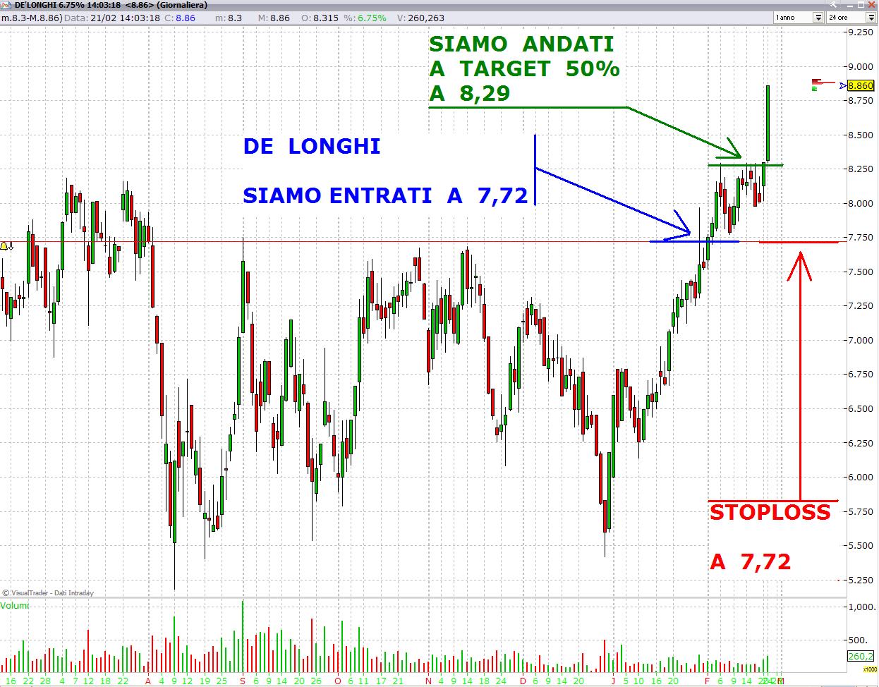 - DE LONGHI, su questo titolo è già successo tutto………fortunatamente !! Entrati a 7,72 dopo poco siamo andati a target 50% a 8,29 abbiamo portato lo stoploss a brekeven……….ed ora godiamoci il viaggio !!!