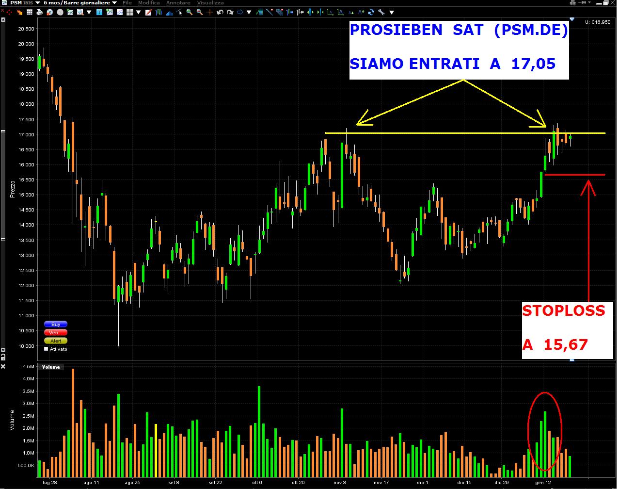 - PROSIEBEN SAT (PSM.DE), anche qui siamo entrati a 17,05 alla rottura dei max relativi di ott/nov. 2011 senza tenere in considerazione il max del 4 nov. a 17,20 fatto con uno spike e con pochi volumi. Lo stoploss di volatilità è anche coincidente con l'analisi tecnica.