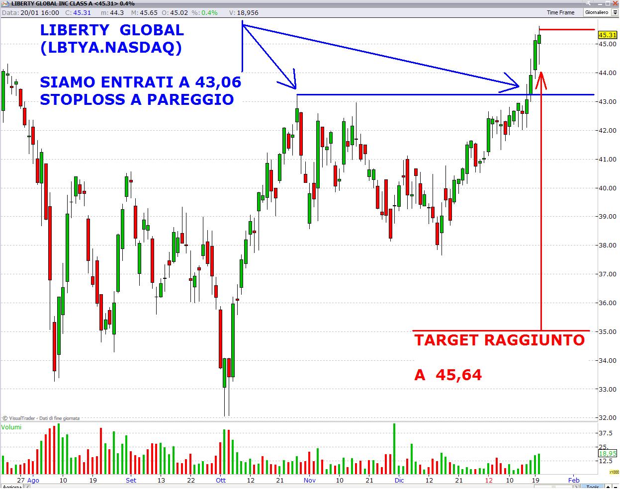 - LIBERTY GLOBAL (LBTYA.NASDAQ), dopo una profonda flessione ad inizio ottobre, il titolo ha fatto registrare un doppio max relativo sporco intorno al livello di 43 $, quindi siamo entrati alla rottura del suddetto livello a 43,06 $. Fortunatamente dopo 3 giorni siamo andati a Target 50% e pertanto abbiamo portato lo stoploss a pareggio.