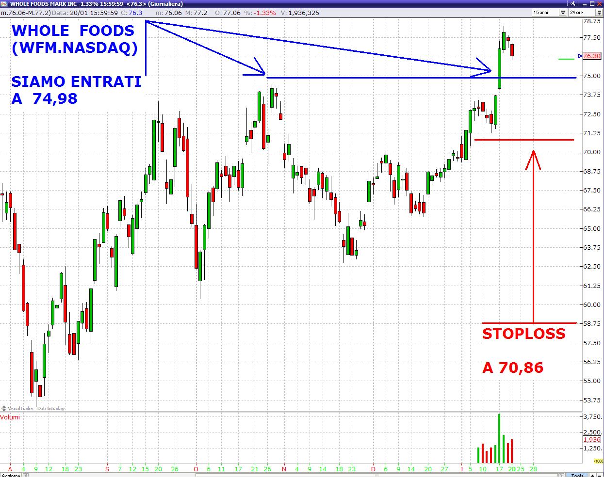 - WHOLE FOODS (WFM.NASDAQ), sul titolo avevamo postato un buy stop a 74,51 $ ma in apertura un ordine consistente ha spazzolato l'ask fino a farci eseguire a 74,98 $ non certo il massimo della vita considerando anche che ha aperto in gap up. Lo stoploss di volatilità è anche coincidente con l'analisi tecnica.