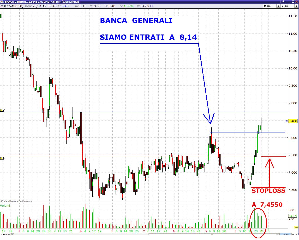 - BANCA GENERALI, su questo titolo abbiamo semplicemente preso la rottura del max relativo di dicembre 2011, supportati anche dalla presenza di un aumento consistente dei volumi. Siamo dentro da 8,14 ?. Lo stoploss è di sola volatilità.