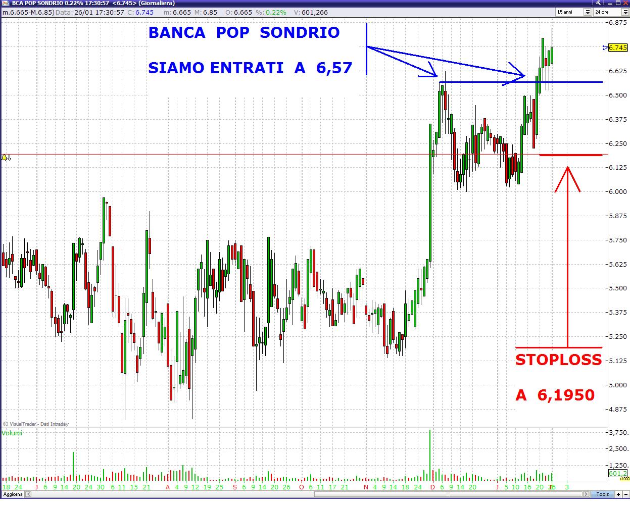 - BANCA POP SONDRIO, uno dei due titoli italiani (l'altro è BUZZI-UNICEM) su cui abbiamo dormito anche se a fine novembre non c'era alcuna voglia di entrare nel mercato italiano vista la sua NON forza relativa rispetto agli altri mercati. L'ingresso originario sarebbe stato alla rottura dei 6 ?, rottura coincidente con l'uscita di ottimi dati di bilancio della banca, quindi dato che crediamo molto sul titolo abbiamo atteso la rottura del precedente max relativo di inizio dicembre 2011, riuscendo a risparmiare qualcosa entrando a 6,57 ?. Lo stoploss è di sola volatilità, con l'analisi tecnica ci saremmo dovuti svenare sotto i 6 ?.