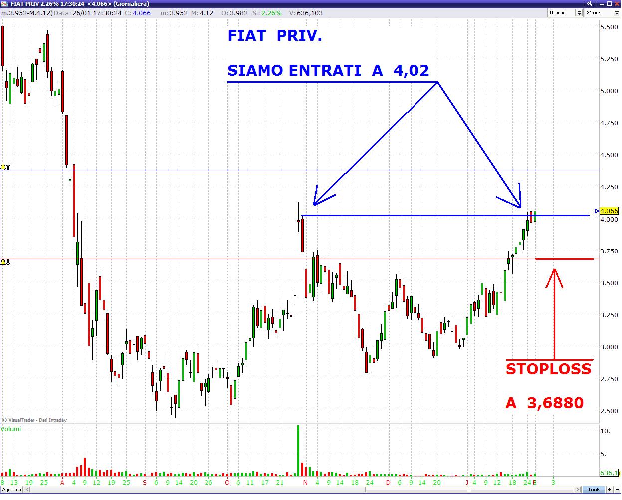 - FIAT PRIV., su questo titolo l'ideale sarebbe stato entrare alla rottura di 3,75 ? non considerando la figura (Island) di fine ottobre, ma sempre per il motivo precedente (scarsa forza relativa del nostro mercato) abbiamo deciso di non rischiare ed attendere la rottura dei 4 ?. Siamo dentro da 4,02 ?. Lo stoploss è di sola volatilità.