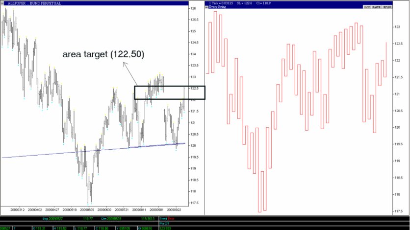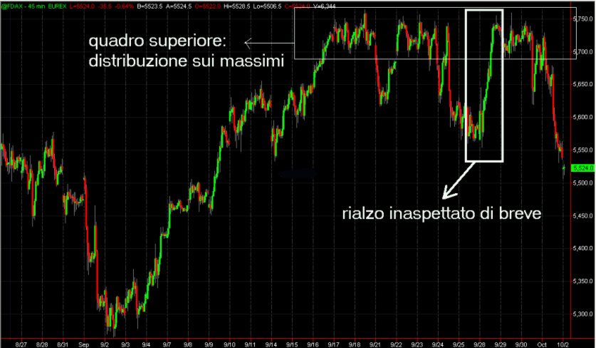 Fig.1: Dax futures a 45 minuti del mese di settembre, in cui si pone in evidenza la contrapposizione tra un rialzo di breve e un quadro di fondo di più lungo periodo in contrasto di trend.