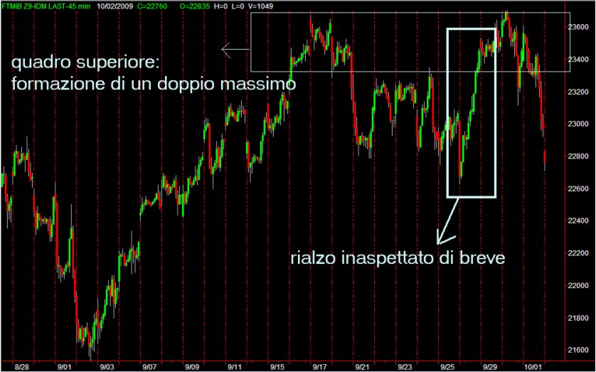 Fig.1: FTSE/Mib futures a 45 minuti del mese di settembre, in cui si pone in evidenza la contrapposizione tra un rialzo di breve e un quadro di fondo di più lungo periodo in contrasto di trend.