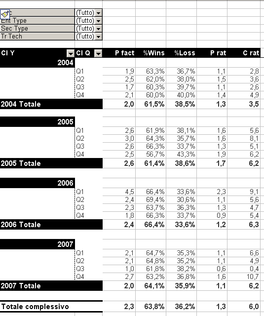 Quello che però salta all'occhio nell'analisi del mio 2007 è la differenza tra il primo semestre (probabilmente i migliori 6 mesi di trading della mia carriera) e il secondo semestre che, pur comprensivo di due mesi (luglio e agosto) di ferie, è stato tra i peggiori della mia carriera.