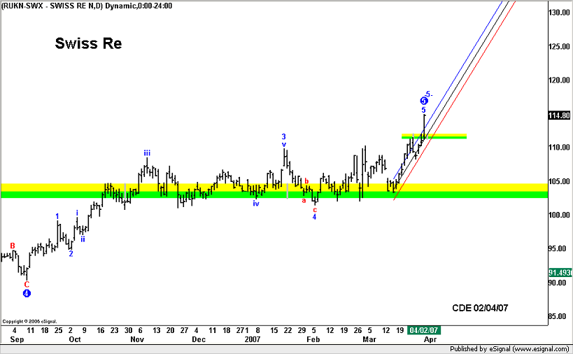 Swisse Re settore assicurativo quotato a ZurigoAcquistare mezza posizione, 5% del portafoglio > 114.90 o sul ritorno a 113.80/60 Stop < 111.