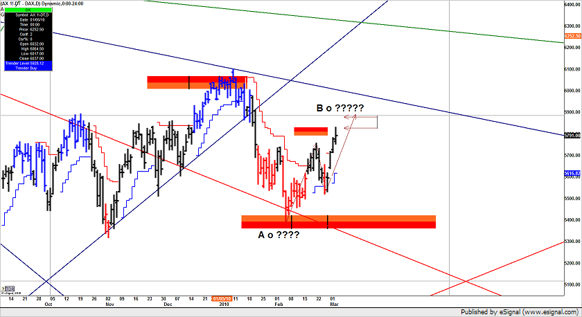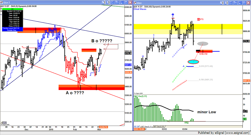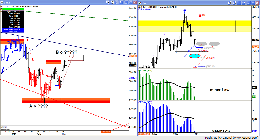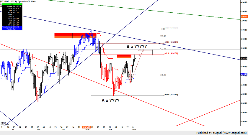 B – sopra 5900 e sopra 1.38 di Euro dobbiamo seriamente pensare a qualcosa di diverso; nel qual caso non si fermerà fino a 6120 ovvero a 1.618 del primo movimento che corrisponde al precedente MAX. In questo caso l'Euro dovrebbe avere un comportamento impulsivo e il Dax altrettanto ….