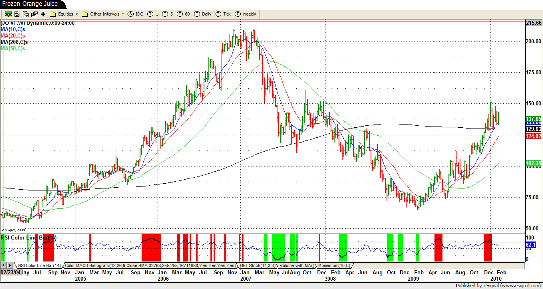 Ho letto pareri di analisti, nei giorni scorsi, che pronosticano prezzi superiori agli attuali del 50% e oltre, altri che invece prevedono una discesa, considerando già scontati gli scenari peggiori. Analizzando freddamente la situazione, da un lato abbiamo un raccolto stimato, inferiore alle precedenti aspettative e questo sicuramente è un fattore bullish per l'OJ, d'altro canto però, non dobbiamo trascurare il fatto che, in presenza di prezzi troppo alti, questo prodotto, soprattutto negli Usa, in passato è stato facilmente sostituito dal succo di mela o da altri prodotti similari.