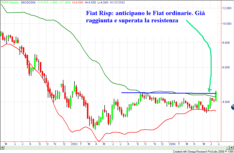 Per la settimana entrante ho nuovamente una prevalenza di segnali rialzisti, soprattutto su titoli "minori". Sui titoli a maggiore capitalizzazione segnalo nuovamente Fiat, perchè nonostante io sia uscito, ho constatato come le sorelle Priv e Risp abbiano anticipato le ordinarie raggiungendo e superando le resistenze. Anche Mediobanca ha una gran voglia di continuare a muoversi verso l'alto (altri titoli indicati nelle settimane scorse come ad esempio Fineco sono invece lontani dai punti d'ingresso). Tuttavia, così come capitato per Finmeccanica due settimane fa, dubito di seguire questi due segnali perchè: