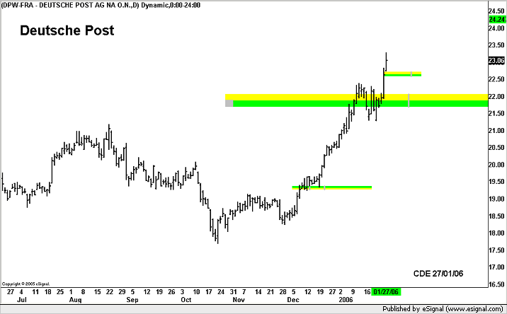 Deutsche Post Settore Industriale quotato a Francoforte.Segnale di rialzo sul Weekly con chiusura > 22.80. Acquistare in apertura Stop < 22.30 daily close