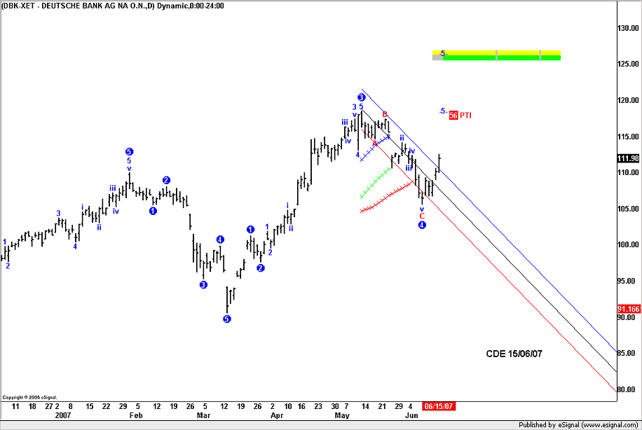 Deutsche Bank settore bancario quotato a FrancoforteAcquistata mezza posizione, 5% del portafoglio a 118.16 Staccato il dividendo il 25/05/07 di 4 euro per azione. Il prezzo di carico ora è di 114.16 Mantenere ma pronti a raddoppiare la posizione.