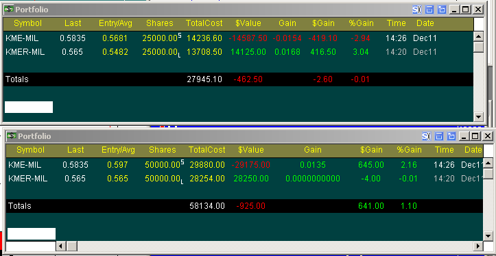 Forse non aveva tutti i torti e se nei giorni scorsi avevo ulteriormente ridotto a 25000 pezzi l'esposizione sullo spread KmeR long (da 0,5482)/ Kme short (da 0,5681) portando a casa un altro tozzo di pane, oggi non appena ho visto 0,597 miglior denaro su Kme e 0,565 miglior lettera su Kmer non ho potuto esimermi da aprirne un altro con 50000 pezzi per i motivi ripetutamente segnalati negli articoli precedenti. Già ho proprio la testa dura…