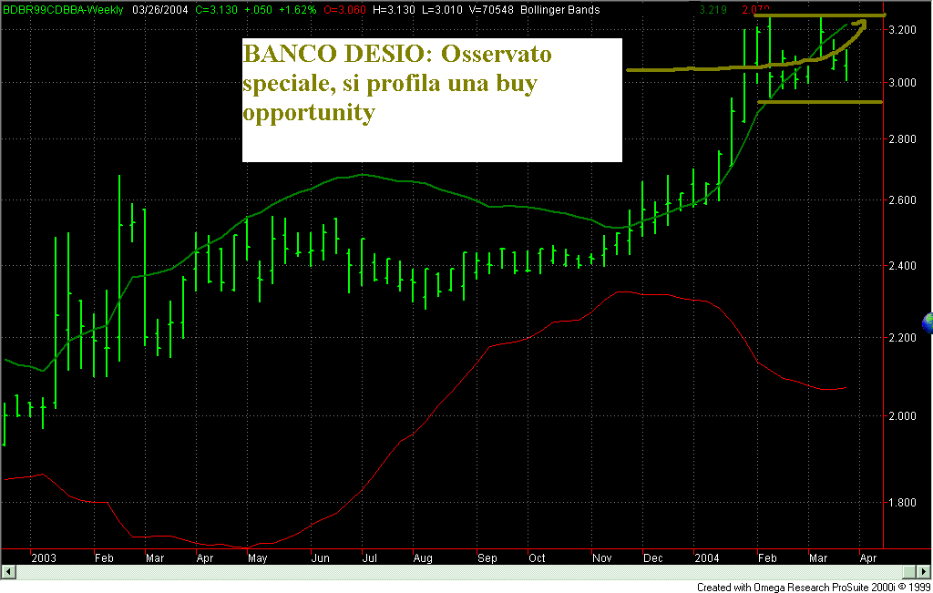 Confesso di non essere un grande estimatore delle bande di Bollinger, soprattutto su time frame intraday (ciò non significa che non siano valide, solo che non lo sono per l'interpretazione che ne faccio io), ma sul settimanale sono spesso in grado di generare segnali significativamente validi ulla maggio parte dei titoli fiutando abbastanza bene la tendenza e si possono utilizzare sia come filtro, sia come conferma di segnali daily.
