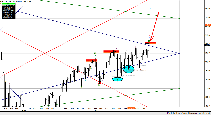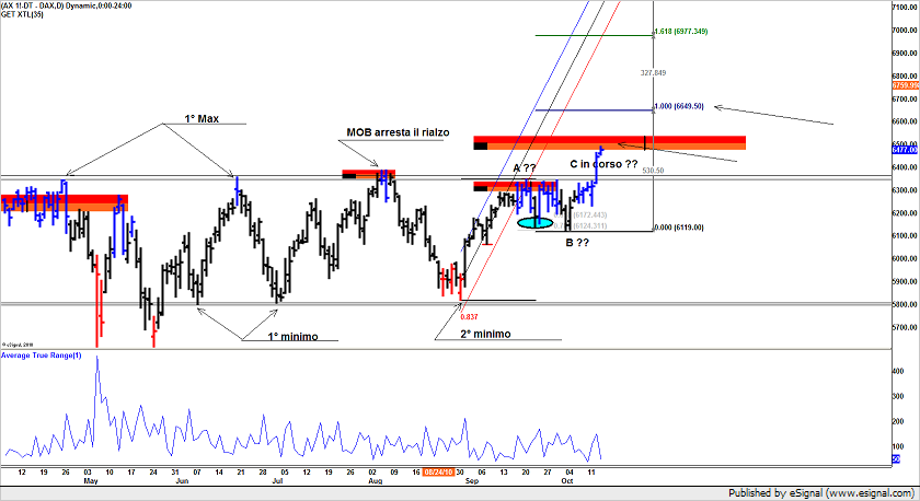 ………… tuttavia la struttura al momento in essere può essere uno schema a-b-c come in figura, e allora i target si discosterebbero. In particolare secondo lo schema abc avremmo che fino a 6650 il rialzo dovrebbe continuare, mentre la presenza delle 2 MOB, in particolare quella settimanale, potrebbe preludere ad un nuovo arresto della spinga propulsiva.