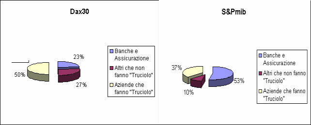 In una riclassificazione casereccia ho voluto mettere a confronto la composizione del Dax e dell'S%PMiB. Ho quindi provveduto ad accorpare Banche e Assicurazioni in uno spicchio, Altri servizi extra truciolo (quali, media/telecom/utility etc) in un secondo spicchio , e nella terza fetta le aziende che fanno ?truciolo? ovvero industrie vere , siano essi cementieri, metalmeccanici, elettronici, chimici, o quant'altro.