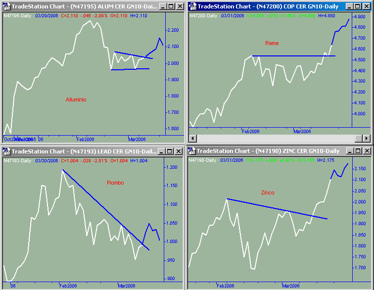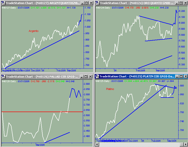 Infine di nuovo argento e oro su nuovi massimi, e platino che cerca di rompere il triangolo in cui si era messo e per finire Palladio in altalena che cerca probabilmente di consolidare i nuovi massimi raggiunti .