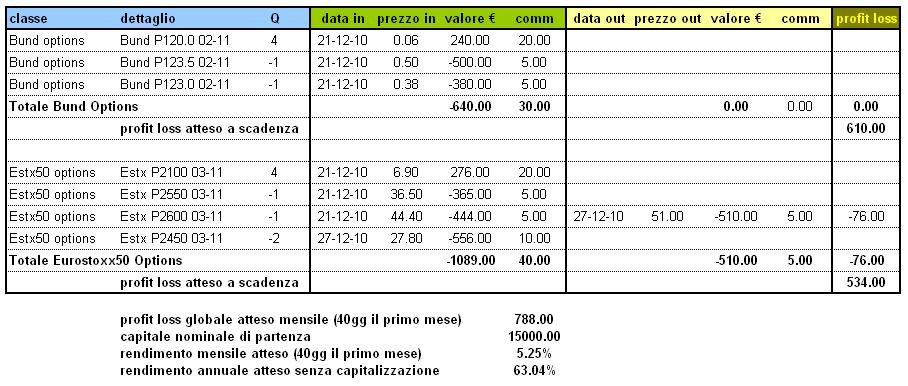 4. il profit loss globale atteso di 788.00? è dato dalla somma del payoff atteso sul Bund alla scadenza di fine gennaio più un terzo del payoff atteso su Eurostoxx a metà marzo. E' solo un valore di massima per darvi una idea di cosa potete aspettarvi, poi è ovvio che se non guardiamo ai movimenti dei margini sul nostro conto noi vedremo un accredito in botta unica di 534 euro al 18 marzo 2011 (salvo ulteriori rolling delle posizioni)