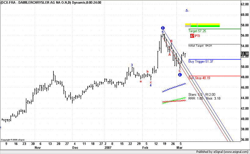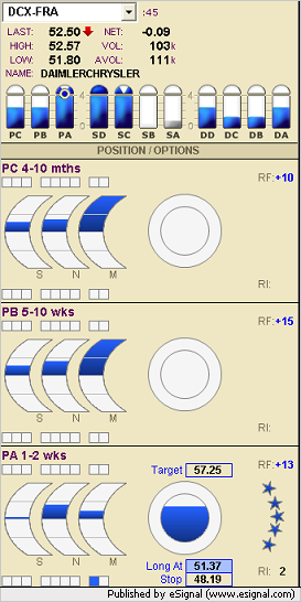 Daimlerchrysler settore auto quotato a FrancoforteUn segnalo long su DTP nella sezione Position trading Stop < 48.19 e target a 52.75 per chi opera con una visione di medi periodo questo è un buon trade , 5 stelle RF di 13 RRR 1.85 RI di 2.