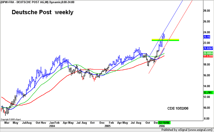Deutsche Post Settore Industriale quotato a Francoforte.Grafico weekly: Siamo entrati in acquisto su un segnale Weekly, determinato dalla rottura della MOB e dal segnale XTL ( colorazione barre blu ) L'obiettivo è ambizioso il target di medio è 28.00, quello di breve a 24.00/20. Siamo long da 23.22 mantenere lo Stop < 22.70 daily close