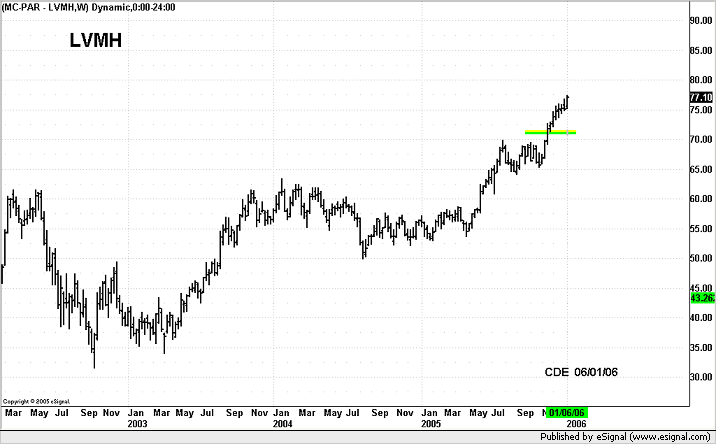 LVMH Settore Personale House quotato a ParigiGrafico Weekly Siamo long da 74.80 Prendere profitto a 79.50/80.00 Stop < 75.80 daily close