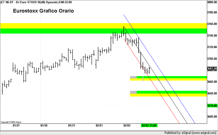 Grafico a 60 minutiIl primo supporto è a 3665/60, il secondo a 3640. Se avremo di chiusure orarie sotto la prima MOB 3660 vendiamo un contratto a protezione della posizione ( per le posizioni da 70/80.000 vendere due contratti ). Posizioniamo lo Stop se avremo un netto recupero di 3675/80 livello che consentirebbe di uscire dal canale di volatilità ribassista e recuperare il supporto a 3675/80.