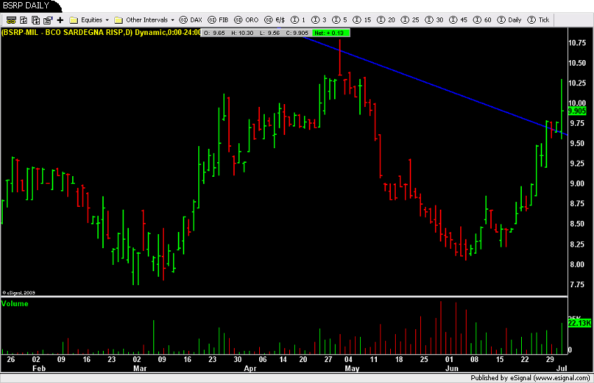 Anche stasera dopo le 16, "i soliti ignoti" hanno iniziato a spareccchiare la lettera su Banco di Sardegna rnc. Io ho alleggerito un 25% della mia posizione a 10,15 (long da 8,825).