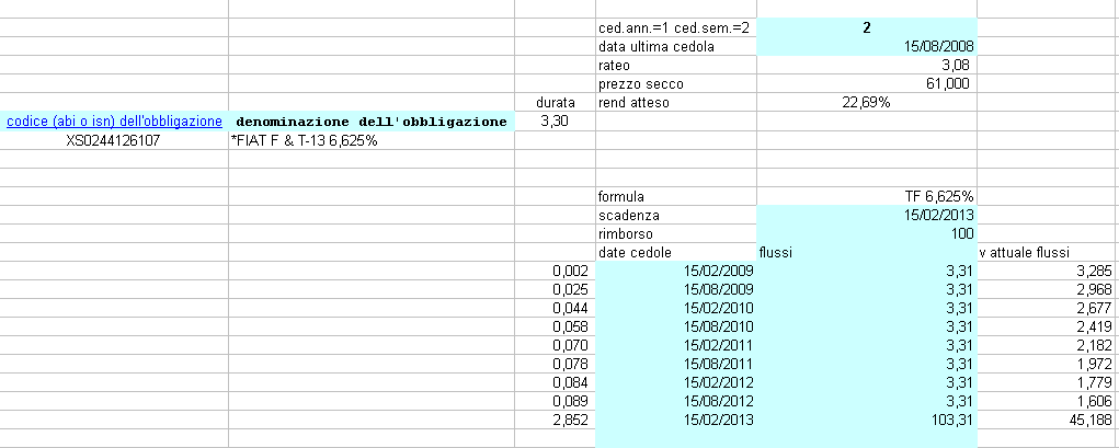 3 % di FIAT F & T-13 6,625% (Isin: XS0244126107) a 61 che paga semestralmente cedole del 3,3125% per un rendimento annuo, salvo il caso di default, del 22,69%
