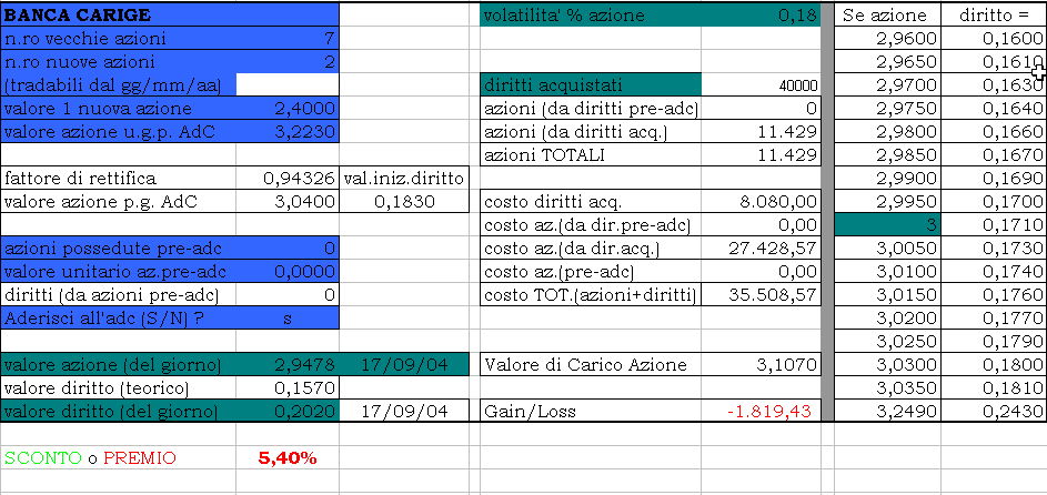 Long 11429 Carige a una media di 2,9478 e short 40000 diritti Carige azionari (CRGAXA) a 0,2017. Il premio è arrivato ad essere anche del 7%. Purtroppo non c'è garanzia di guadagno perchè non si può rimanere short overnight dei diritti e pertanto bisogna chiudere l'operazione in giornata.