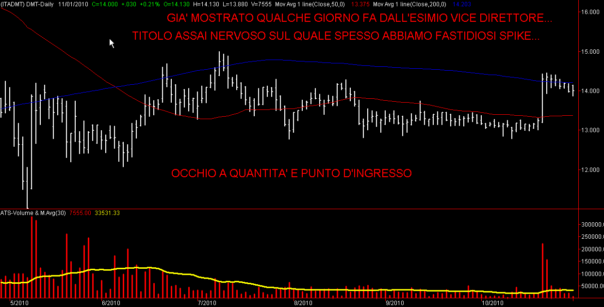 Ecco perché da buon trader discrezionale (ottimo aggettivo per dire che faccio quello che mi pare) ho da anni scartato le entrate al superamento di un livello, ma preferisco se un titolo mi interessa cercare nei movimenti del book un indizio che mi faccia scegliere se entrare il più delle volte in anticipo. Quindi quando qualche collega mi chiede il mio metodo di ingresso sul mercato rimane basito alla mia risposta assolutamente non ironica ovvero ?entro ad minchiam?. Attenzione che non ho assolutamente la pretesa di dire che il mio modo sia il migliore, anzi… Però è sicuramente quello con cui io mi trovo meglio soprattutto dal punto di vista psicologico.