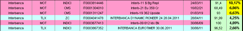 Infine devo una risposta a un gentile abbonato che mi chiede come mai una così decisa esposizione sul titolo INTERBANCA 24.03.2011 IN $ rispetto alle altre obbligazioni in portafoglio. Secondo me questa rimane una delle obbligazioni più sottovalutate del MOT, ma niente meglio dell' immagine qua sotto allegata può rispondere: quando un titolo (a mio parere solo perché in valuta diversa dall'euro) rende da 3,5 a 7,5 punti percentuali più degli altri dello stesso emittente si può derogare un pochino dalle regole!