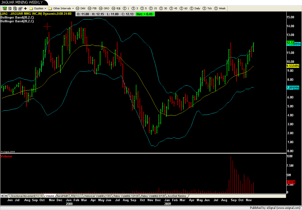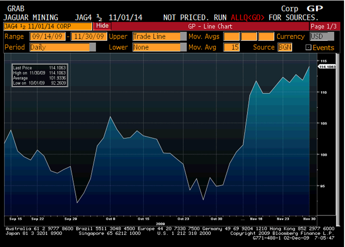 Due grafici relativi a titolo (Jaguar Mining) e convertibile (Jaguar Mining 4,5% 2014) valgono più di mille parole…