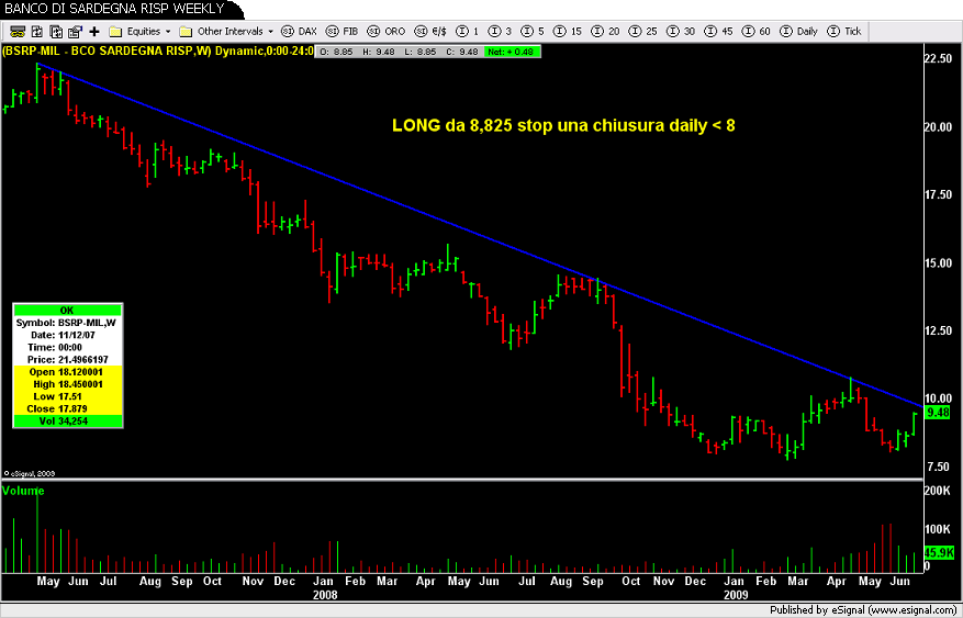 Io sempre dentro da 8,825 con stop una chiusura daily < 8, ma guardando il grafico settimanale si dovesse riuscire a rompere prima la trendline discendente poi il precedente massimo a 10,79, ci sarebbe veramente da divertirsi…