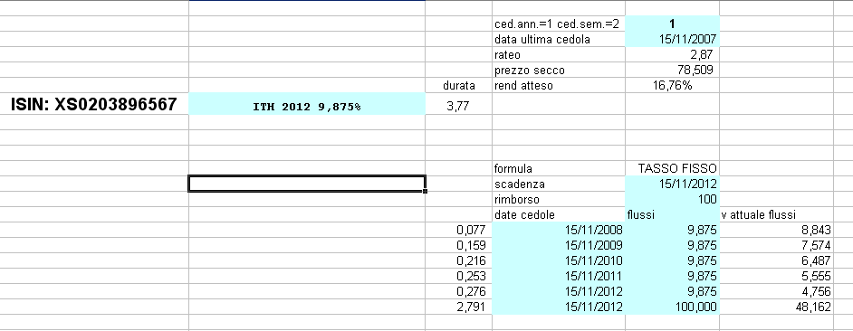ITHolding è in questi giorni passata allo Star e ha un'obbligazione scadenza 2012 con cedola del 9,875% annuo. Ora il rating è CCC e parliamo di un bond che acquistato a 78,5 rende circa il 16,75% annuo. Inutile dire che la rischiosità è elevatissima ed io per esempio ne ho comprato un quantitativo pari allo 0,5% del mio portafoglio obbligazionario.