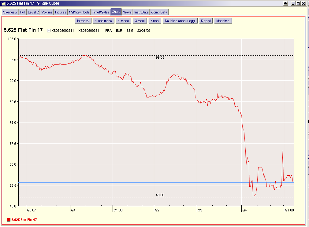 Continuo a seguire attentamente le obbligazioni Fiat sull'euromercato dopo essere uscito dalla 2011 in gain, con l'idea sì di rientrare, ma possibilmente allungando la scadenza (ho nel mirino soprattutto la 2017 di cui allego un grafico) in modo da rischiare meno in termini di capitale e di garantirmi un determinato rendimento più a lungo. Per ora la FIAT 5,625% scad. 12/06/2017 (Isin: XS0305093311) staziona tra 50 e 53 (rendimenti annui intorno al 16%), ma per il momento io sto fermo in attesa di vedere se anche sulle obbligazioni Fiat avverrà ciò che sta avvenendo sull'azione…