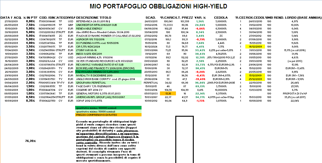 Uscendo dal tema high-yield ed entrando nel campo delle convertibili italiane in settimana ho venduto sia le convertibili IGD (acquistate il 14 luglio 2008 a 76,5) che le convertibili Beni Stabili (iniziate ad acquistare ad agosto 2007 e su cui avevo una media di carico di 92,12). Motivo di queste vendite è che a 92,5 le Igd e a 97,4 le Beni Stabili rendevano rispettivamente a scadenza il 5,75% e il 3,94% rendimenti non affatto disprezzabili, ma che ritengo di essere in grado di superare con la mia operatività. Inoltre il fatto che la convertibile IGD avesse un quantitativo minimo di 100000? nominali mi teneva ingessato una gran fetta di portafoglio che preferisco suddividere su più emittenti. Riguardo sempre alla convertibili italiane (le ultime emissioni di Credito Valtellinese e Pop Milano sono lontane anni luce dalle caratteristiche io pretendo da una convertibile) ho in portafoglio (escludendo la piccola quantità di Cogeme e Sopaf nel portafoglio high-yield) in ordine di capitale investito: Ubi 2013 (pmc 109,4), Sias 2017 (pmc 88,47), Bim 2015 (pmc 92,35), Carige 2013 (pmc 111,55).