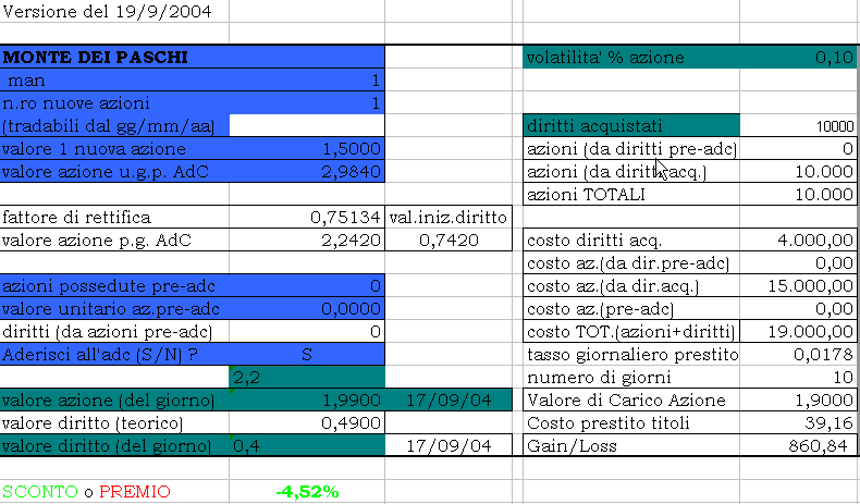 Ogni 10000 diritti arbitraggiati con la vendita di 10000 azioni BMPS da mantenere short anche considerando il prestito titoli (0,0178% giornaliero su directa) si avrebbe un utile di 860?.