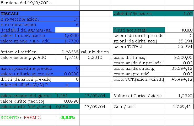 Long 100.000 diritti a 0,082 e short 35294 azioni Tiscali a 1,281. Un 3,5% (3,83 – circa uno 0,3% di prestito titoli) in massimo 10 giorni non è disprezzabile. Speriamo solo non richiamino i titoli…