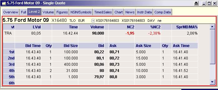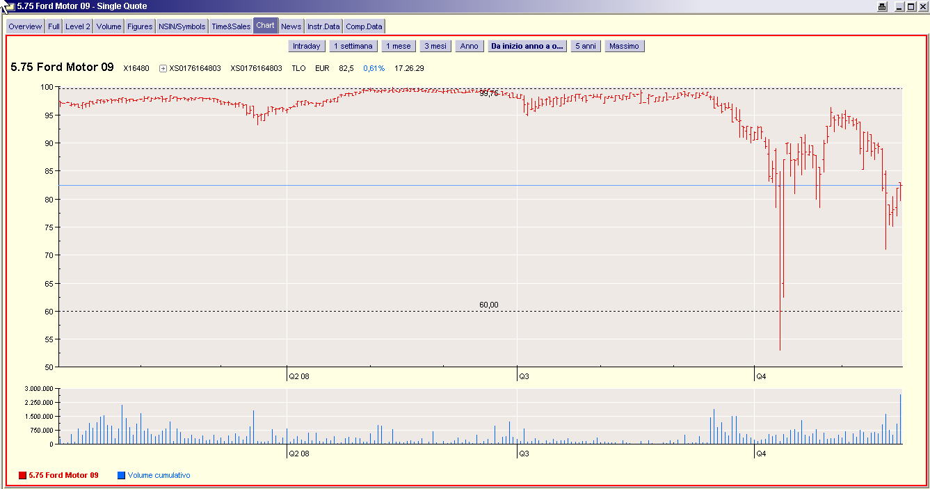 - Un altro 2% di FORD MOTOR CREDIT COMPANY 5,75% scad.12.01.09 (Isin: XS0176164803) portando la mia media di carico a 80,1. Su questa obbligazione oggi si sono letteralmente impennati i volumi (allego grafico su dati SIX TELEKURS e book alle 16,42 dove si vede la forte pressione in denaro) e io ho raggiunto la massima esposizione da me decisa sull'emittente Ford (ovvero il 3% del totale del mio portafoglio obbligazionario). Ricordo per i non addetti ai lavori che il rischio di default sembra essere elevatissimo e pertanto solo dosando i quantitativi di ingresso (consiglio spassionato è appunto di non superare il 2-3% del capitale dedicato all'obbligazionario) si può evitare un antipaticissimo bagno di sangue. A mio parere però il 25% in 40 giorni (questo è quanto manca alla scadenza di questa obbligazione) è una remunerazione sufficiente a rendere interessante il rapporto rischio/rendimento