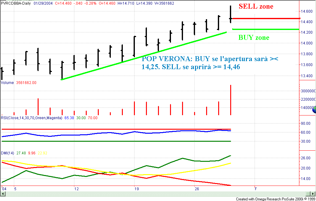 Pop Verona: Sell se l'apertura sarà >= 14,46, Buy se l'apertura sarà < 14,25