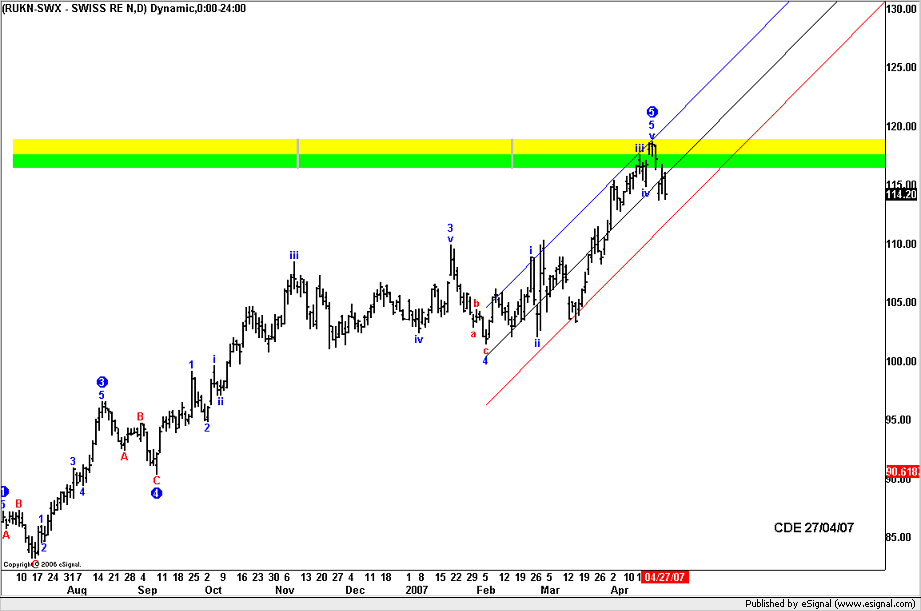 Swisse Re settore assicurativo quotato a ZurigoAcquistata mezza posizione, 5% del portafoglio a 115.00 Staccato il dividendo il 25/04/07 di 3.4 CHF per azione, il prezzo ci carico diventa 111.60. Mantenere.