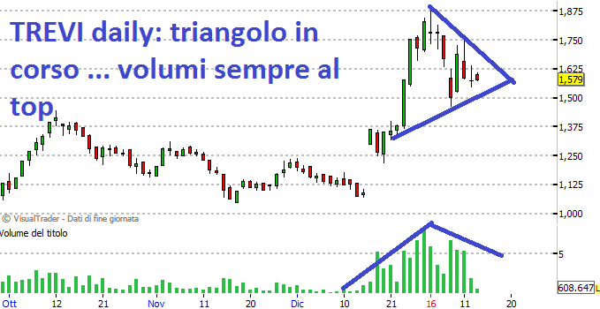 TREVI: titolo illiquido, un po' fa paura, perché non sarebbe da entrare con 400 abbonati. Però quello che vedo io è quello che vedete voi, un triangolo di quelli da manuale dopo un bottom up sempre da manuale. E i volumi non accennano a diminuire, anzi sono sempre in acquisto. Da tenere ritagliato sul comodino.