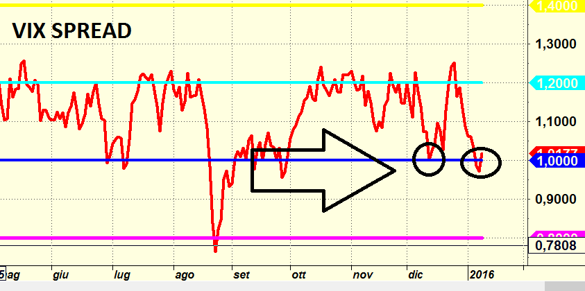 Avevamo una visione del mercato molto semplice: non puoi gridare al lupo quando sei poco sopra di un supporto fondamentale. O hai a disposizione la sfera di cristallo che ti dirà cosa farà quel mercato a cavallo del supporto oppure conviene aspettare il raggiungimento del supporto e capire di che morte si deve morire. Questo in un contesto in cui i miei indicatori segnavano brutto tempo ma non l'apocalisse: vedere il caso del VIX spread (VIX a 3 mesi su VIX a 1 mese) che si è portato in zona 1, ovvero normale oscillazione negativa.