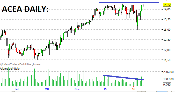 ACEA: ha un roe del +11,24% nel 2014 e una buona storia di redditività. Il 2015 è atteso in linea con la recente storia di una redditività ROE a due cifre. Non l'abbiamo mai comprata, ma de facto ha corso finora. Guardate in che maniera il ribasso di questi giorni sia stata semplicemente una scusa per accumulare il titolo. Ora siamo a cavallo della resistenza, se ci fosse un punto per entrare dovremmo essere i primi. Rimane il grande dubbio che si tratta di una utility e se davvero fosse vero che ci dobbiamo mettere a comprare utility allora dovremmo riconsiderare molto di quanto segue. Attendiamo gli eventi.