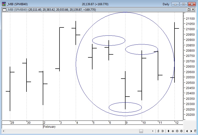 Per formare due massimi intervallati da un minimo idealmente sono sufficienti 5 giorni: i primi 3 servono a individuare MAX1 (il primo e il terzo giorno fanno massimo minore di quello del secondo), dal secondo al quarto (il secondo e il quarto giorno fanno minimo superiore al terzo) generano MIN1, dal terzo al quinto generano MAX2. Se osservate il grafico sottostante, riferito all'indice FTSE MIB (l'etichetta dice SPMIB40, ma è solo l'etichetta ad essere sbagliata), capirete di cosa sto parlando: