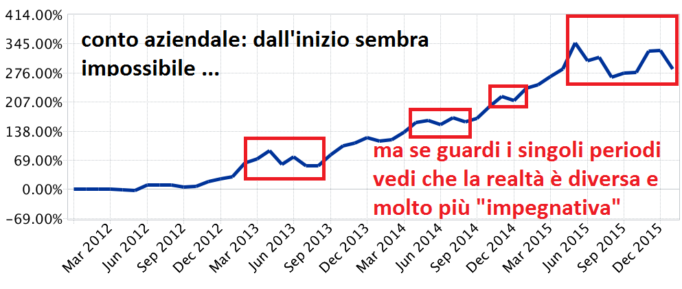 E siccome nessuno nasce imparato vi mostro la equity line del conto aziendale in derivati (che in realtà è un contone) dove se guardate la equity dall'inizio come sempre sembra un amore ma se prendete gli ultimi 3 mesi penserete che se potevate ne avreste davvero a meno. Questa è la realtà del trading, e pensate a cosa dovrei pensare se invece di partire nel lontano 2012 sulla equity line che segue fossi partito 8 mesi fa.