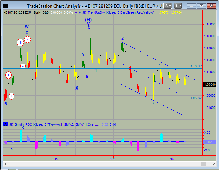 Uguale ma di segno opposto la situazione sul cross Euro/Dollaro dove il massimo di onda 4 a 1,1061 regge il quadro ribassista di un'onda 5 che dovrebbe portare le quotazioni dell'Euro sotto il minimo dello scorso anno di 1,0451. Il superamento del massimo di onda 4 invaliderebbe lo scenario.