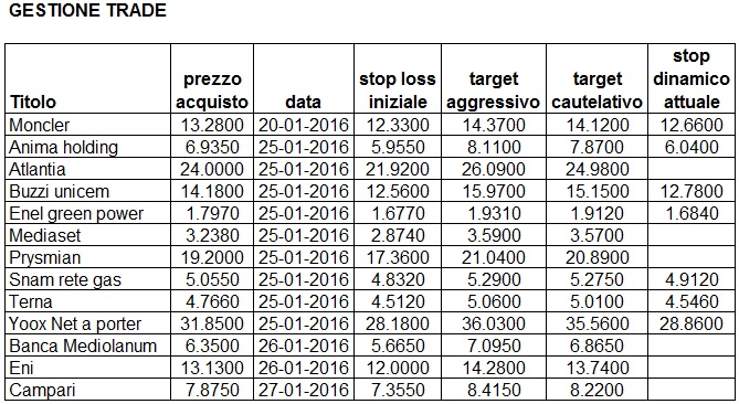 Sostanzialmente stabili tutti gli altri titoli in portafoglio, con qualche lieve movimento rialzista che ha portato a nuovi massimi di periodo e quindi a piccoli aggiustamenti negli stop dinamici. E' entrata la posizione su Campari.